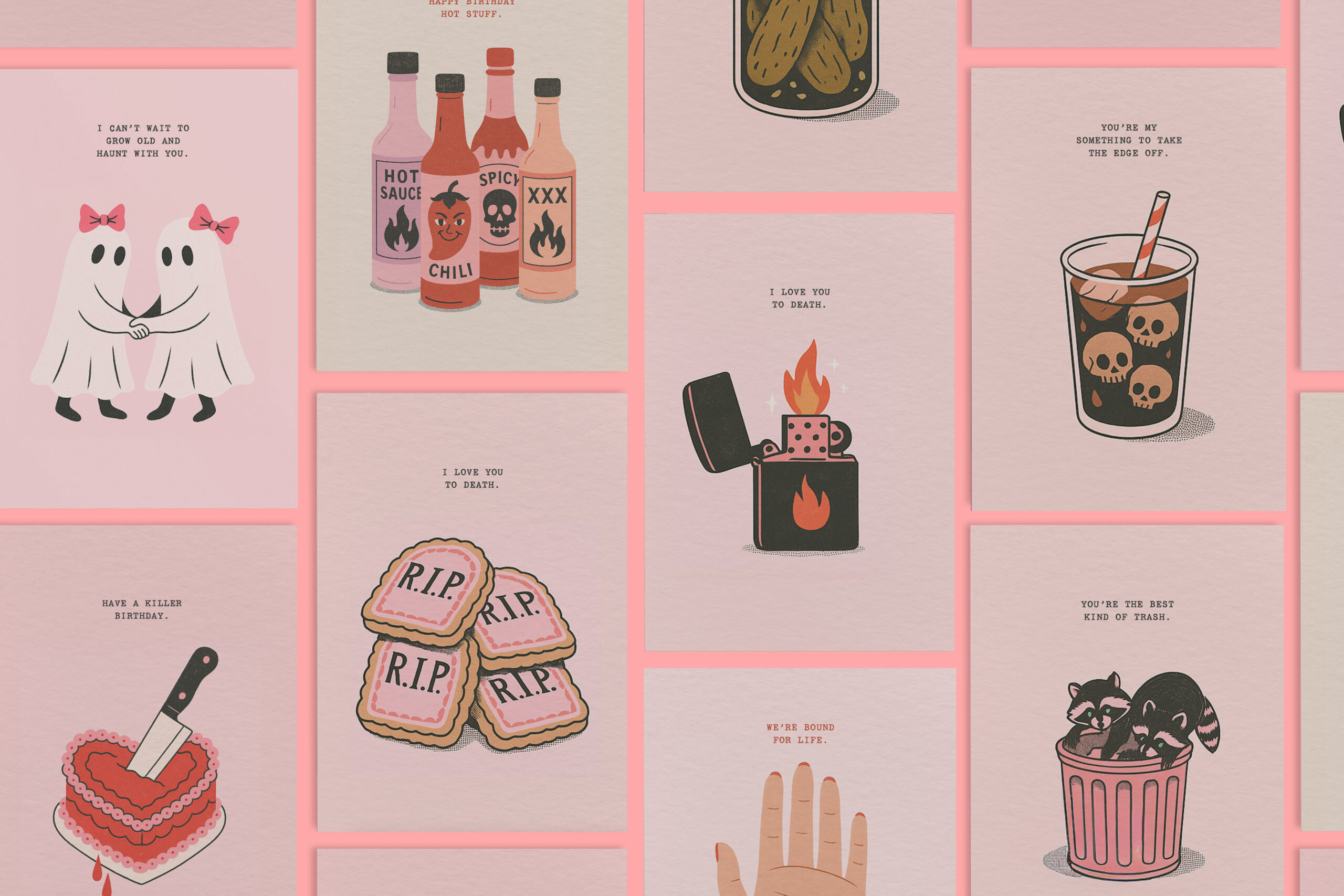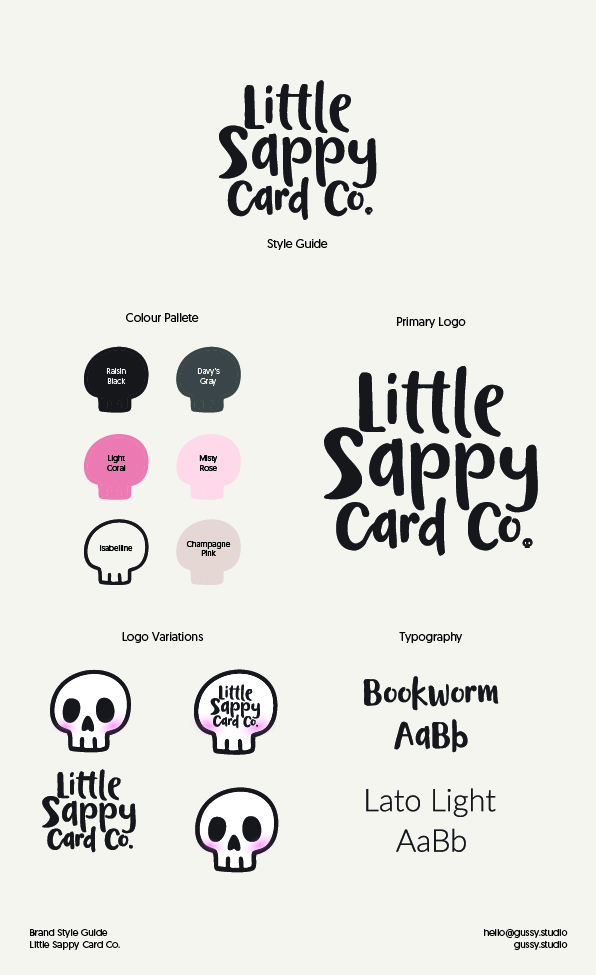 Sappy Little Card Co. is an online greeting card shop serving up pun-filled, cheeky designs with a heavy dose of sass. Think bubblegum pinks, sparkles, and skulls, all wrapped in sweet-meets-sinister vibes. They needed a brand identity that matched the energy of their existing card illustrations and stood out in an oversaturated stationery market.